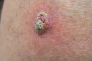 Elevated Growth with a Central Depression: Often resembles a wart or a volcano-like nodule. The surface may be crusted or ulcerated.